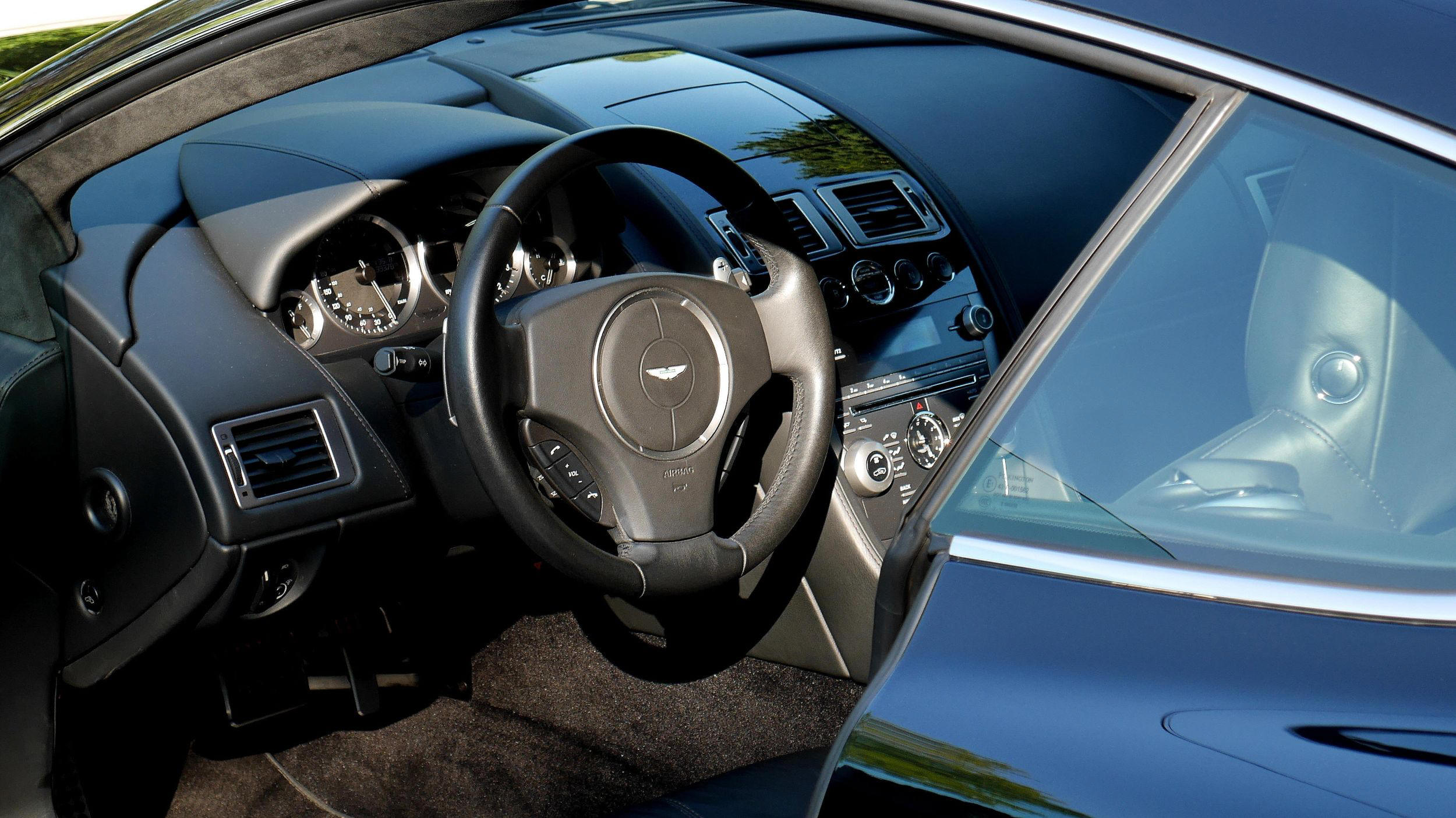 Performances extrêmes et élégance réunies en bonne intelligence, une Aston Martin est rare et pourtant sa silhouette est familière, identifiable au premier regard, devenue comme un symbole. Cette DB 9 Coupé, V12, est magnifique, finie en noir ( Jet Black ), sellerie noire (Obsidian Black) assortie rehaussée de coutures "Chocolat ". C'est une première main, acquise neuve à Monaco, ayant peu roulé et scrupuleusement entretenue.